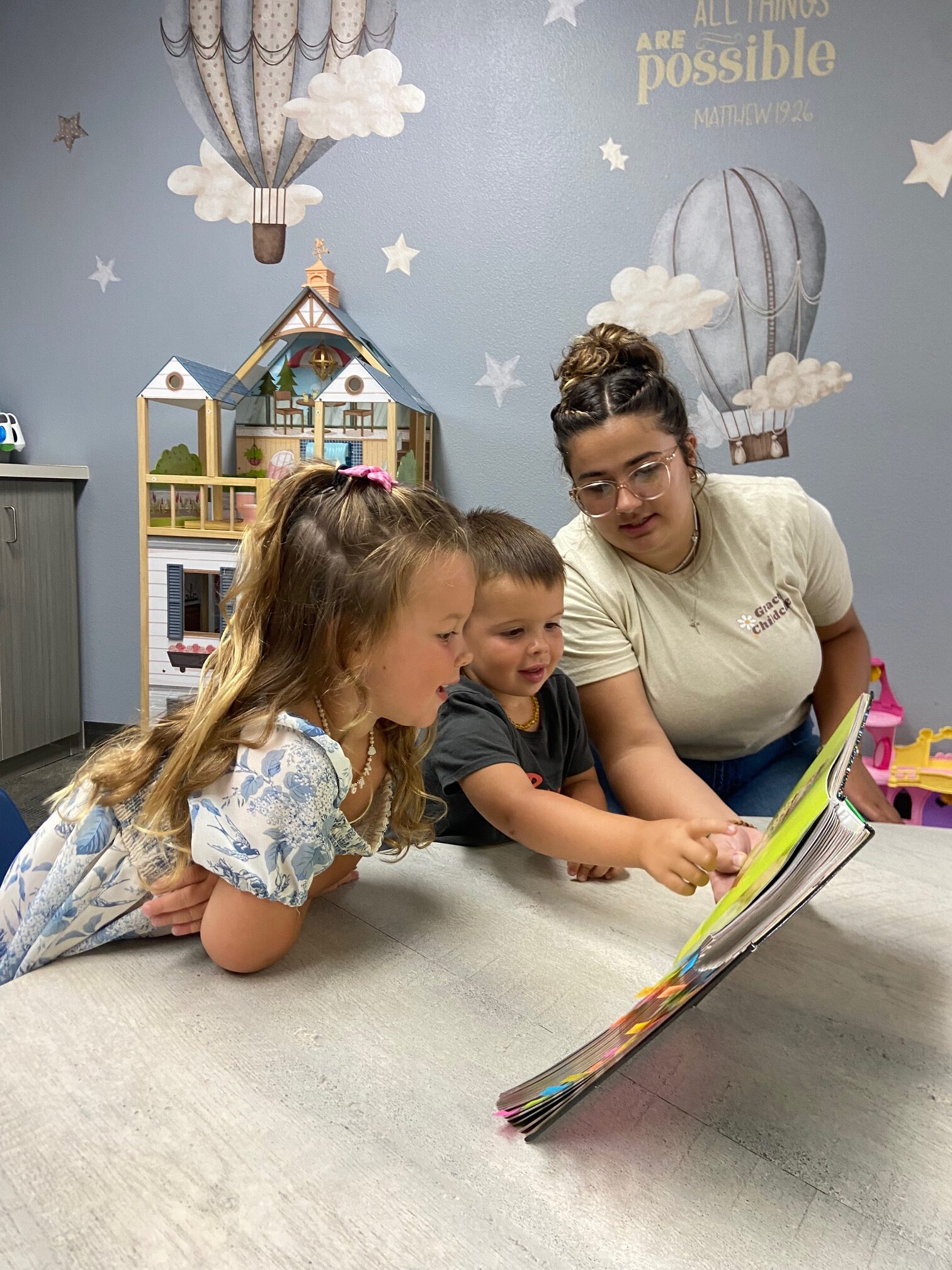 For children ages 2 and up, CCC provides a more structured program that aligns with the lessons taught during Sunday mornings at Grace Fellowship Church. Each week includes Bible stories, crafts, and memory verse practice. Children also learn how to participate in a classroom setting, explore their emotions, and grow in understanding of the Fruit of the Spirit—love, kindness, gentleness, and more.